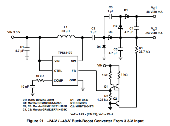 在-48V基础上再增加一级chargepump就是-96V.    微调R1或者R2, 使得Vo2输出是-25V, 那么第三级chargepump就是刚好输出100V.