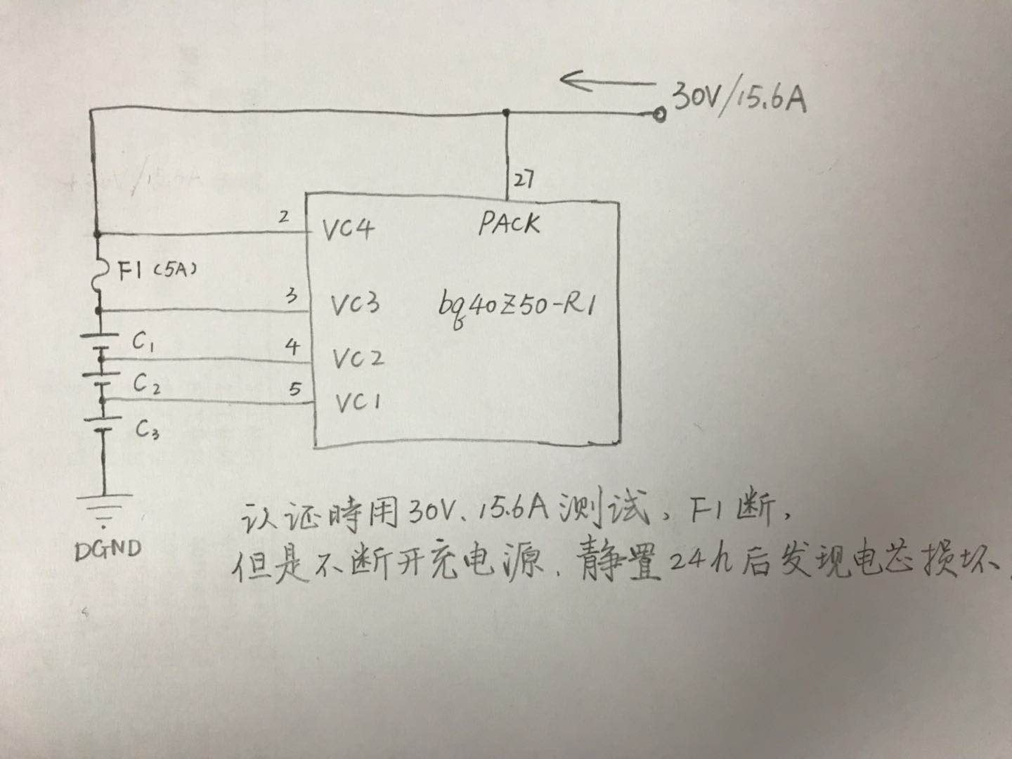 认证测试时,将充电控制MOS管直接短路(UL要求),然后用30V、15.6A进行滥充测试(UL标准)。