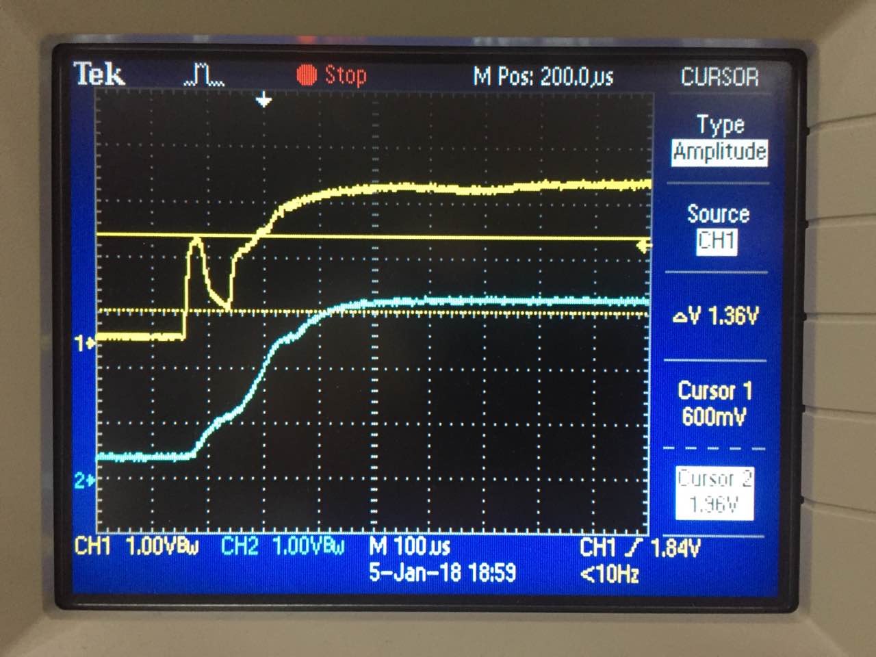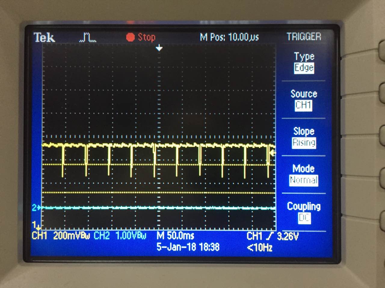 反复上下电,概率大概有1/10,异常时的输入输出都有幅度272mV周期50ms的下尖峰