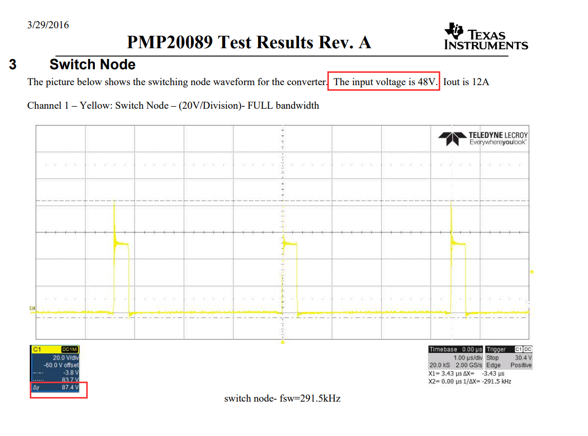 看到LM5117的官方开发板-PMP20089测试报告中SW的节点过冲很大,输出电压48V,最高可以冲到87.4V,算出来过冲有81%