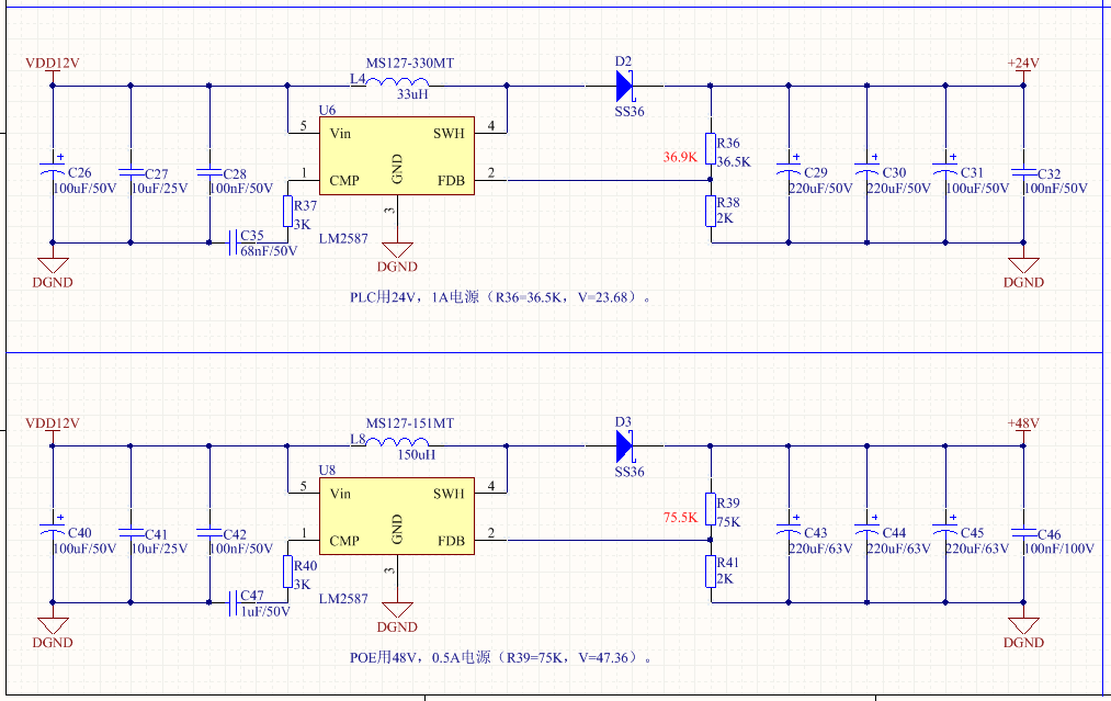 你好!我用LM2587ADJ 12V升24V,12V升48V,升24V的输出带1A负载,除了发热,峰峰值为600mV以为再工作正常。但升48V的,带0.1A左右的负载,电路就有响声,而且用示波器测试出现了锯齿波,负载增大到0.5A时,响声更大,而且锯齿波的幅值也随着增大,示波器显示峰峰值3.4V,不知为何,是我电感太小还是我的肖特基二极管SS36使用不当?