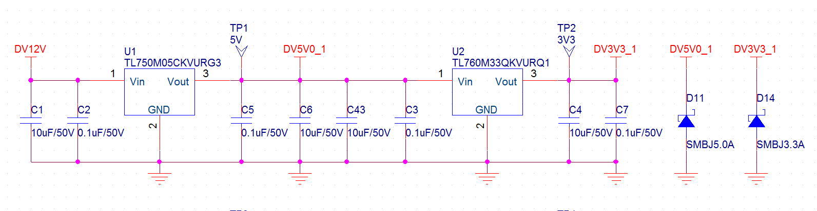 最近在使用封装TO-252的TL750M05CKVURG3时遇到一个问题。连接线路图如下图: