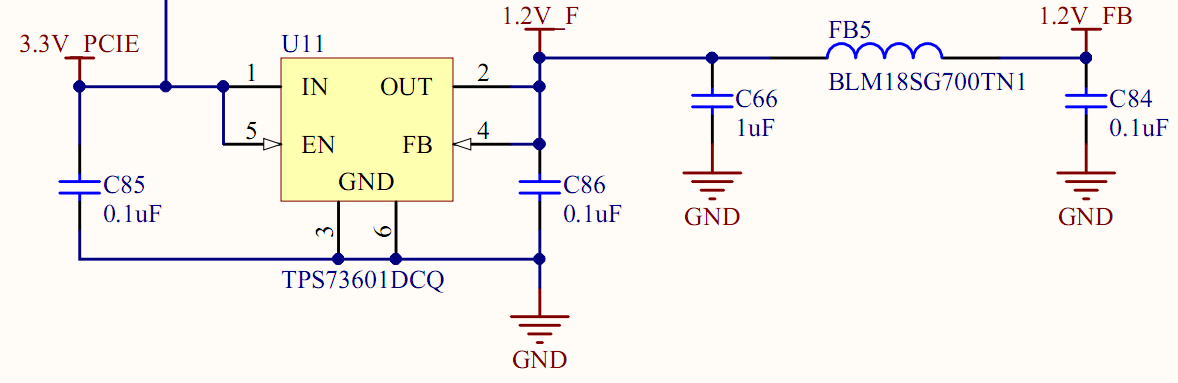 输入电压来源于PCIE插槽3.3V,EN使能端也接PCIE 3.3v ,1.2v_F为输出电压。1.2v_FB为磁珠隔离后的电压
