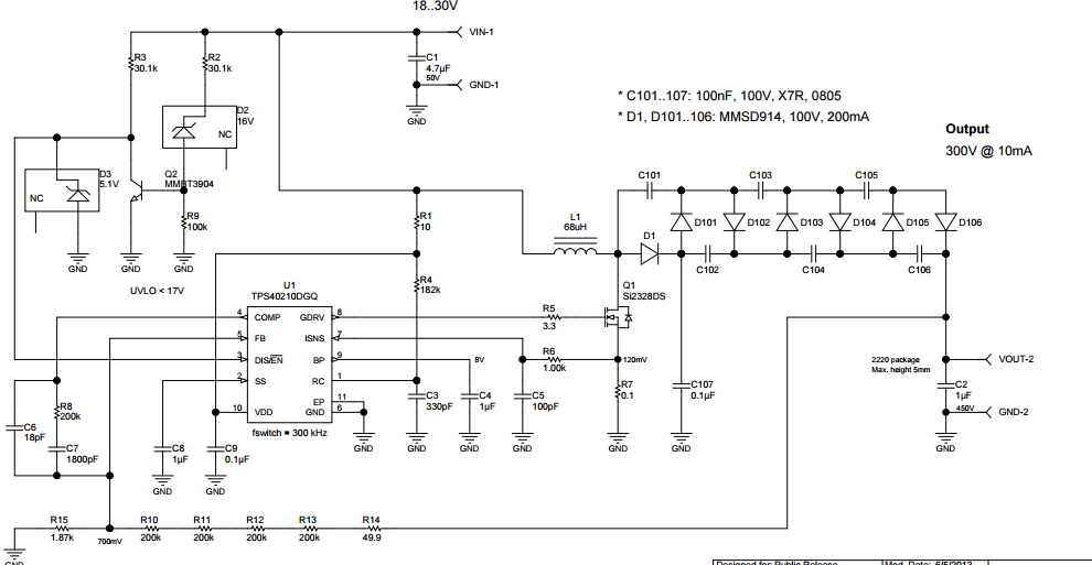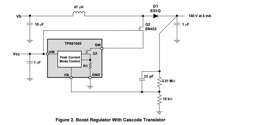 你好,很高兴看到你的回复。刚画好图了,我是要利用这个芯片,把输入9V的电压升到260伏来用,要求电流很低,mA级别。电路已经画好,但是在手册中没说明Cout如何选择计算,在手册的事例图中(手册第18页,8.2.1,Figure30)是把3.3升到5伏使用,选用的充电电容电容(Cout)为10V,100uF。我升到200多使用,电压高了,很难选到这么大容量的电容,不知道这个电容应该如何选择?