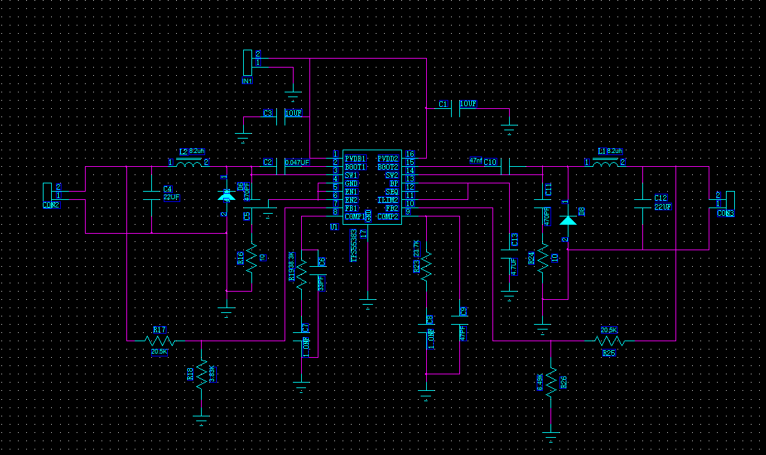 为何连个通道都没有输出那?测得2脚和15脚有一个5V频率波,8脚和9脚的电压的问哦0.57V