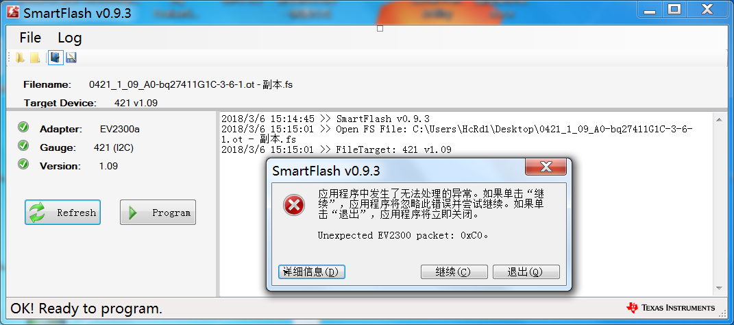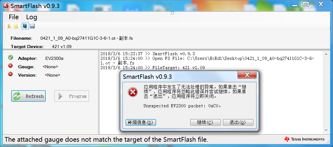 2、接EV2300,不接bq27411G1C电路板和电池,不出现截图错误。但是打开 .ot.fs文件后显示找不到文件。接入bq27411G1C电路板和电池,按refresh按钮刷新,还会出现unexpected EV2300 packet的错误。