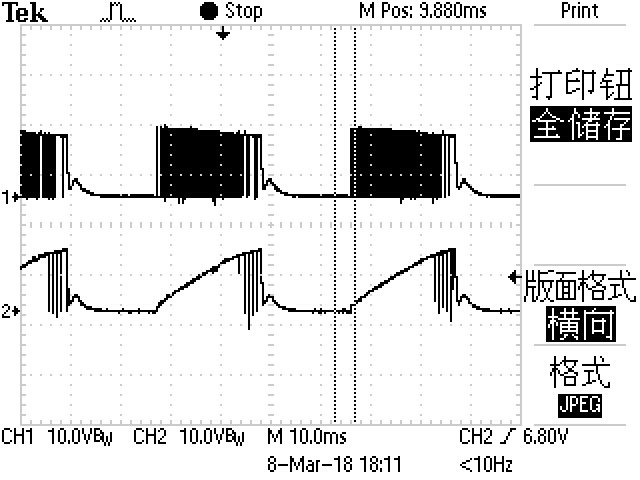 设计要求为输入9V~18V,输出12V/4.5A。 使用WEBENCH仿真设计得到的原理图及TI提供的PCB板。在重载工作时(3.2A以上)时,在12.6V~13.4V区间会进入断续振荡,无法稳住电压,下面是测试波形,其中CH1通道测量是SW1的波形,CH2通道测量的是SW2的波形。振荡发生时电压/电流会下降到5.5V/1.5A左右并随振荡上下跳动。 请问是什么问题,怎么解决,谢谢!!!