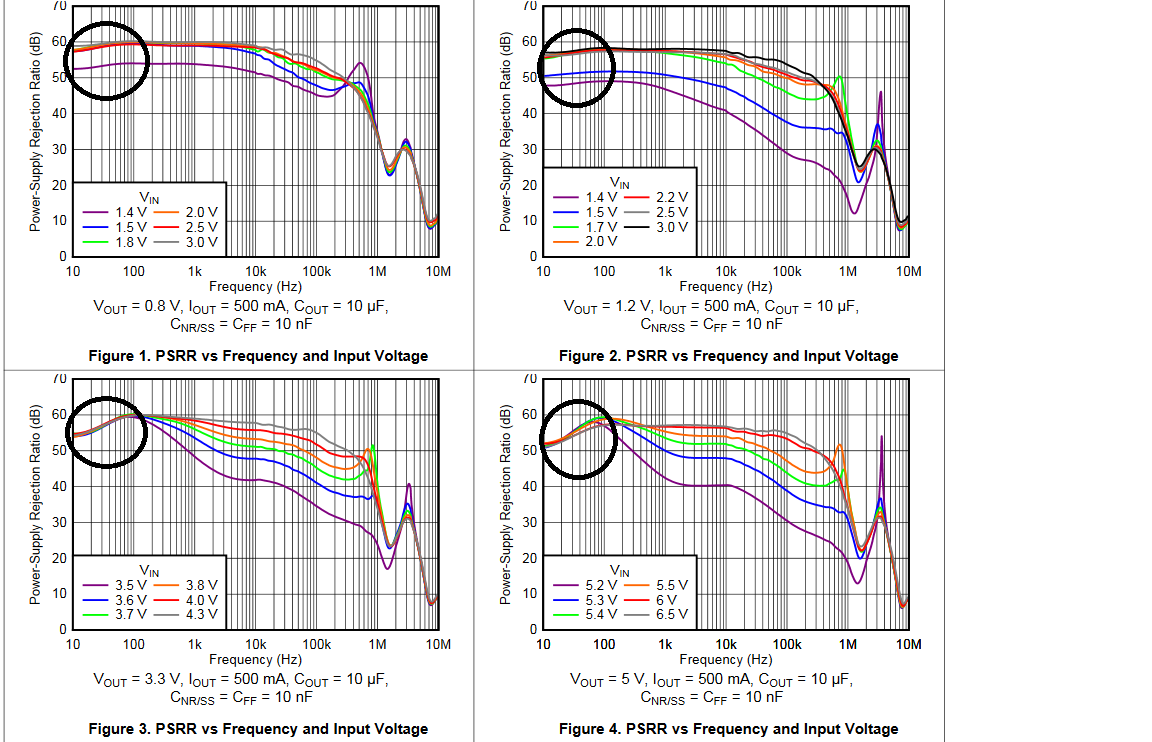 如下图,对于低频10Hz~100Hz之间,figure1和figure2测试结果显示这段频率内,PSRR曲线是平直的。但是figure3和figure4测试结果显示这段频率内,PSRR曲线是斜的,频率越低,PSRR越低,这是为什么?
