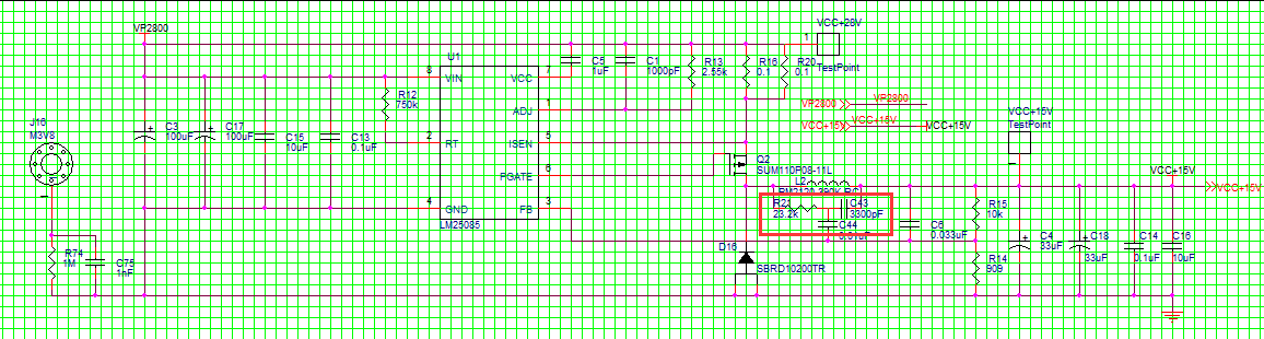 但是今天上午有新的发现,将最后输出的那个33uF的电容,增加一个数量级,换成了一个1000uF的大电容后,带载能力正常了,即输入降到15.4V左右后,MOS管变为100%全开,输出为15.0V.而且调解输出电压,TON和频率也随着VIN的变化一起变化了,这样我认为是正常的。开通时间TON也由原来的15uS变为8uS左右,频率由原来的37KHZ,变成了69KHZ.但是频率仍然和计算值128KHZ左右不符。相差将近一倍。