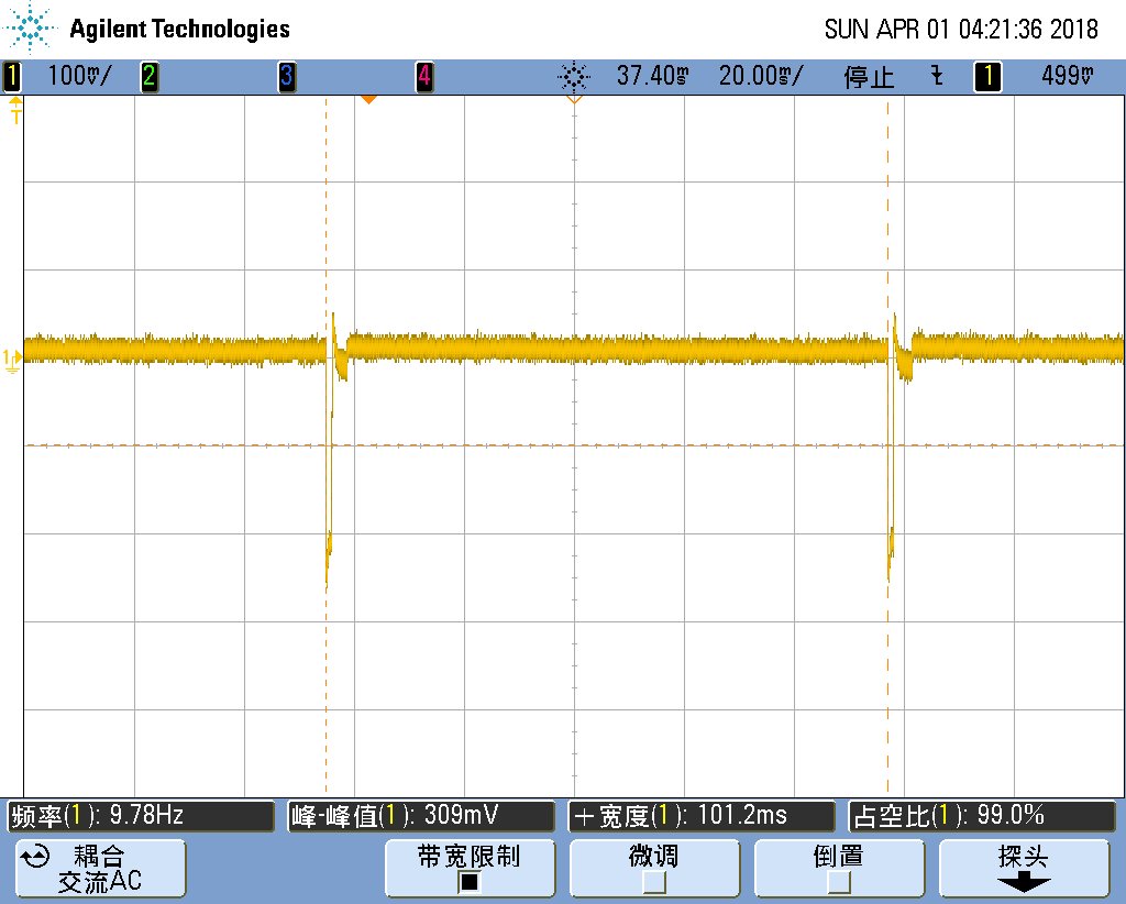 调试中没有接锂电池,外部接5V-1.5A apapter 对系统供电,挂上负载后(负载耗电800mA),TPS61252输出端VSYS上有脉冲出现,脉冲间隔100ms;vpp=309mV, 非常有规律。 如图;