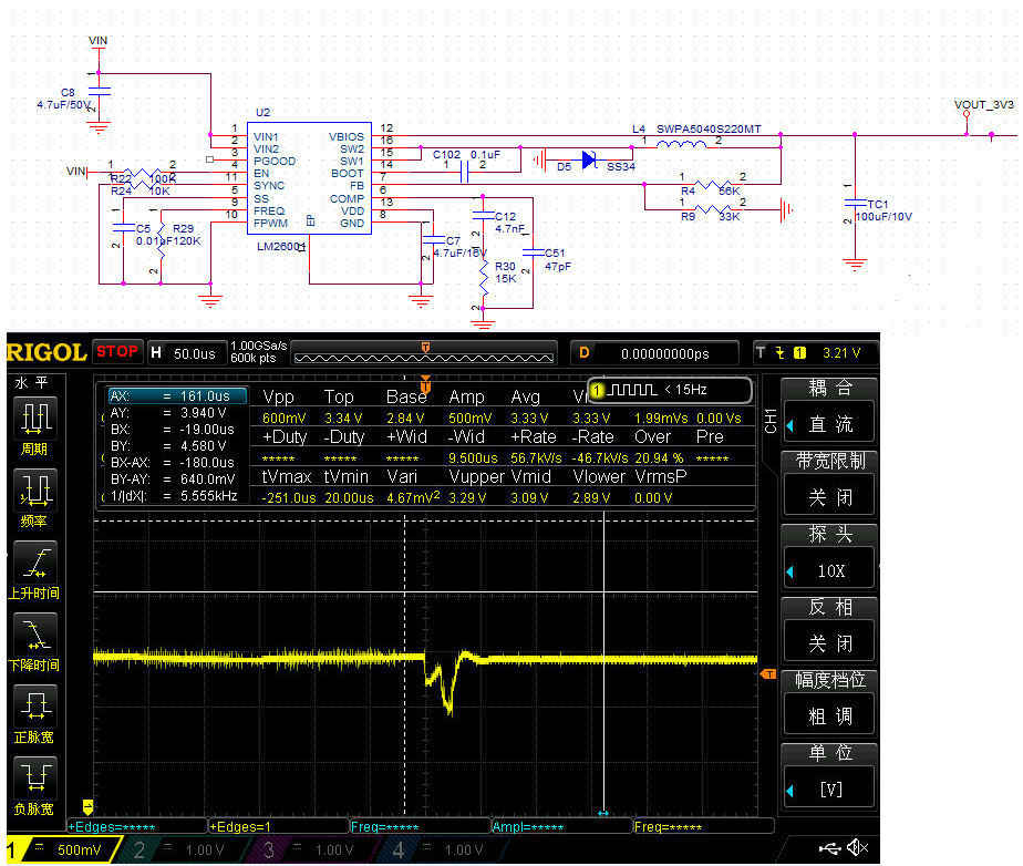 我在想是否是因为跳变之前负载非常小,芯片工作在(休眠模式),而负载突然变大,使得LM26001芯片改变了工作模式(PWM模式),是否和这个切换时间有关系?