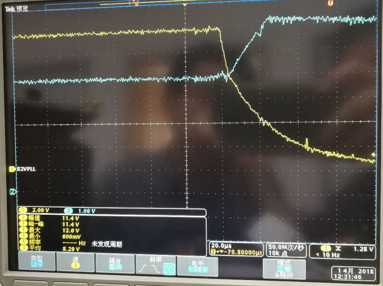 现象:在TLV62130的后端负载突然关闭后,62130的输出5V会出现一个抬升,实际用示波器测到的波形如下图所示,其中蓝线是输出电压,黄线是EN PIN