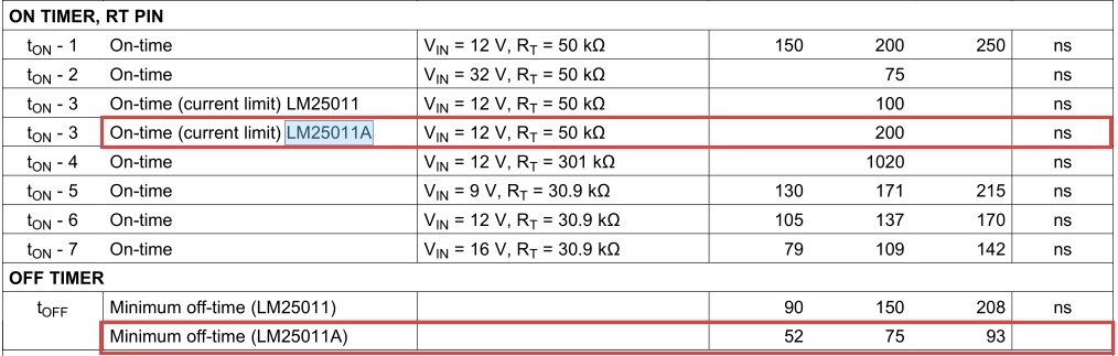 LM25011和25011A,不一样25011A在低压时能保持高开关频率;规格书上说到:The LM25011A has a shorter minimum off-time than