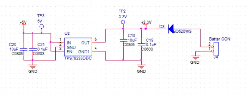 使用芯片:TPS78233,输入:5V,输出:3.3V/100mA;