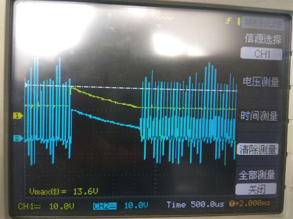 由于以下波形导致,输出会有一个14V的尖峰电压。目前换过后端的二极管、MOS、电容、芯片,通过测量替换下来的件都没有损坏。