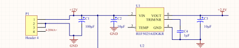 我使用的是REF5025IDGKR的芯片,输入电压10V,技术文档上写输出电压2.5V,可是实际输出电压不是2.5V,实际输出仅比输入电压少1v,求助,谢谢。附上电路图。