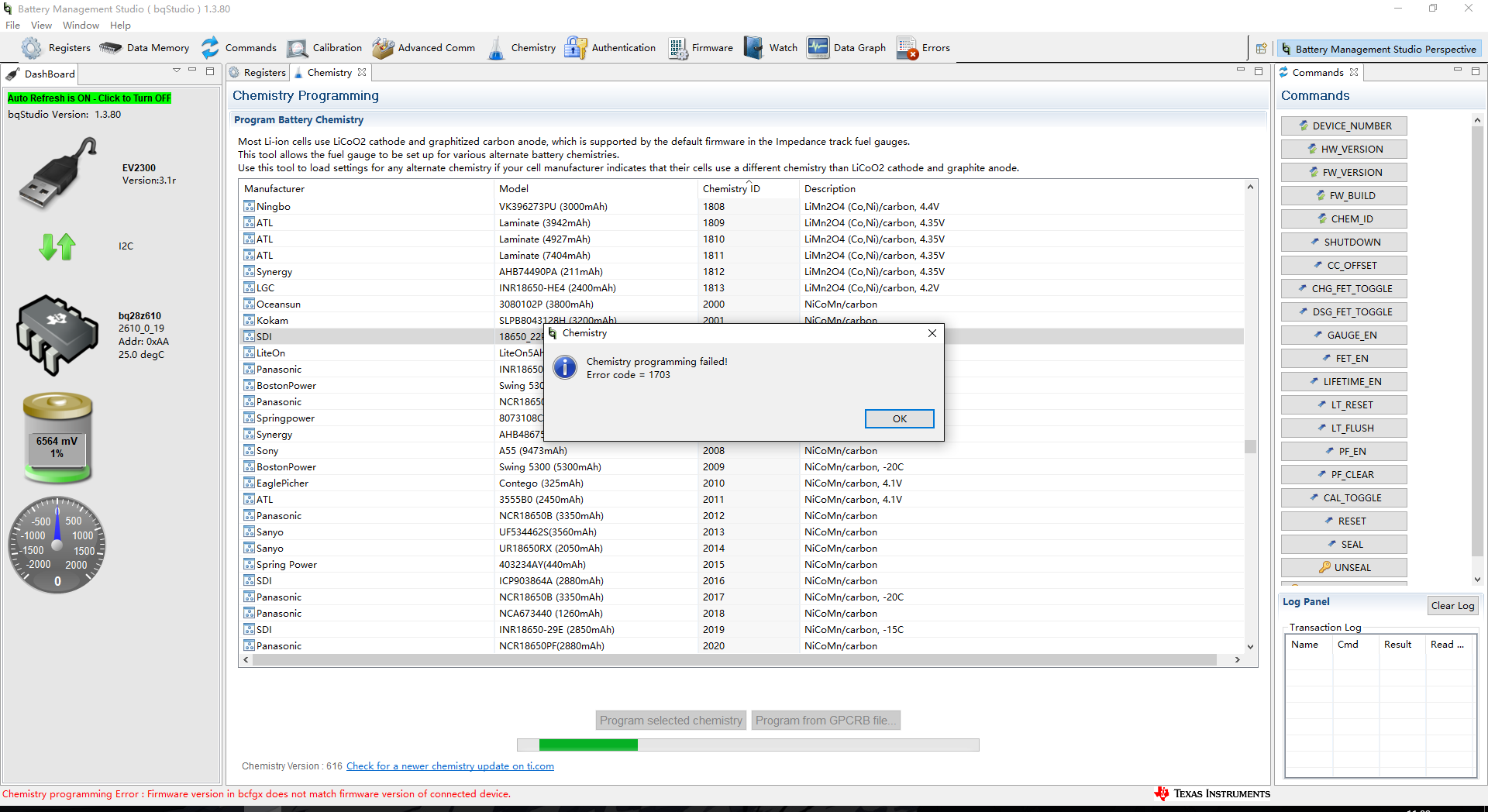刚开始芯片是可以烧录化学ID的,但是我下载官方.srec(bq28z610_v0_19_build_24.srec)文件后,在烧化学ID时遇到以下错误: