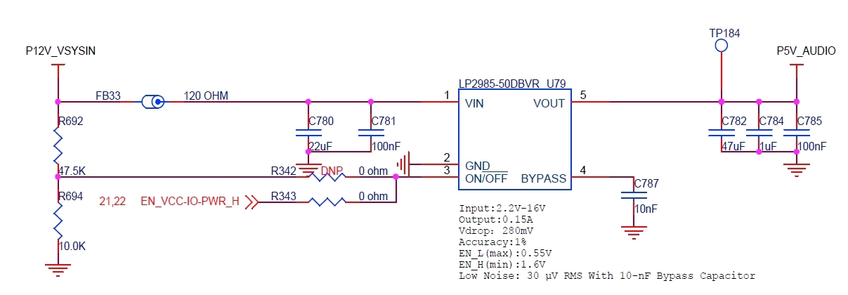 LP2985-50DBVR在近期小批量生产中发现,11颗纹波较大的情况。电路设计如下截图所示,LDO输出P5V_AUDIO电源,用于音频部分供电;