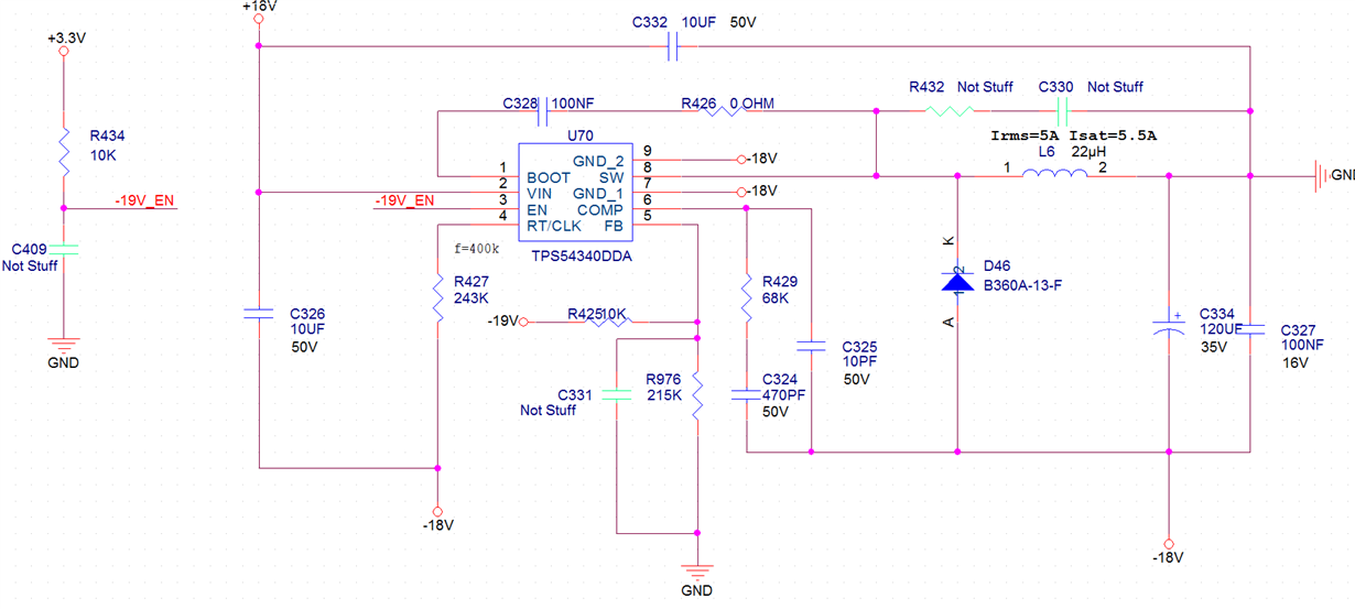 上图为使用TPS54340 +18V转-18V线路,请问线路有没有问题?enable的逻辑电平对不对?由于第一次画负电压线路,不是很熟悉,还望指教,谢谢!!