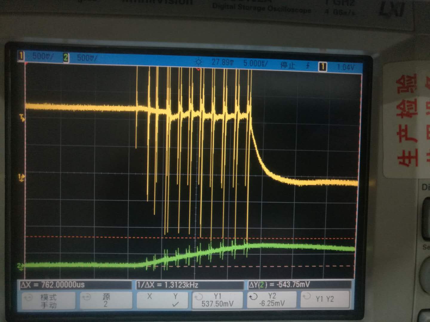 绿线为电源上电波形,黄线为输出电压波形(台阶启动),蓝线为启动电流,想请教几个问题: