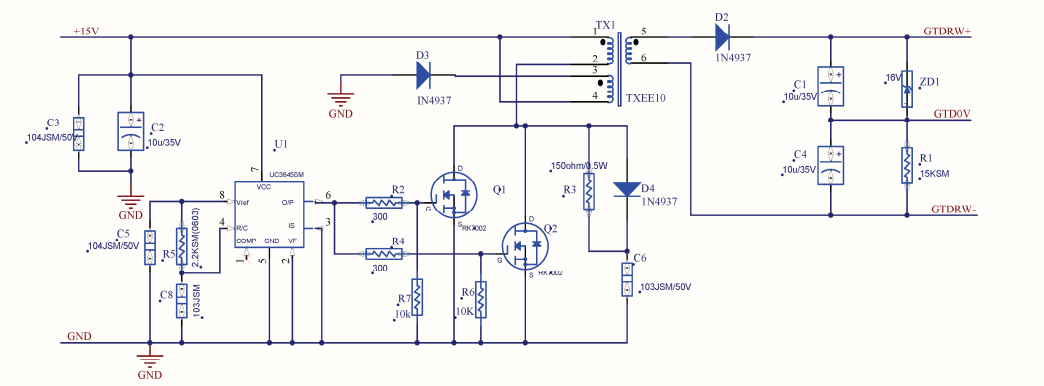 1.想请教一下下面电路的功能是什么?因为自己看懂了光耦隔离电路,大概知道GTDRW+和GTDRW-代表电源电压和地,也搜了一下UC3845芯片手册,但还是不太理解这个电路功能和运行机制。