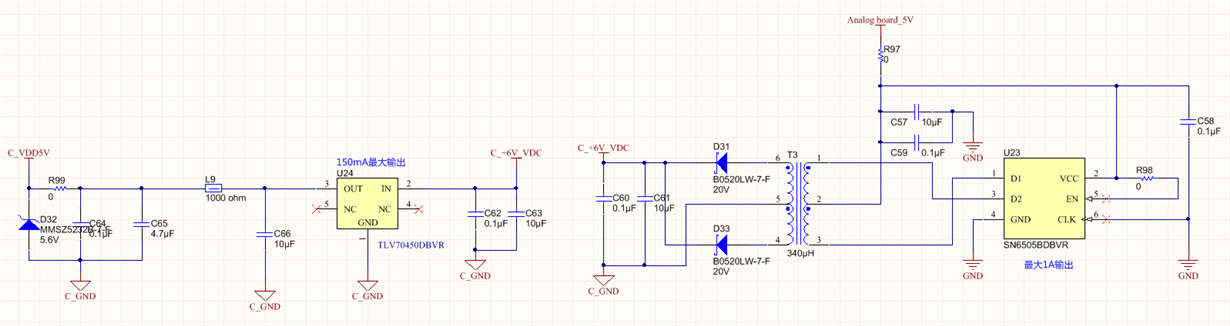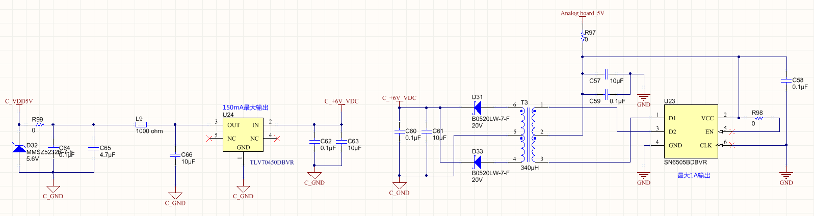 我现在根据官方的一个参考设计,设计一个隔离的电源,驱动器是SN6505DBVR,变压器是750313734,LDO是TLV70450DBVR,如下为设计图: