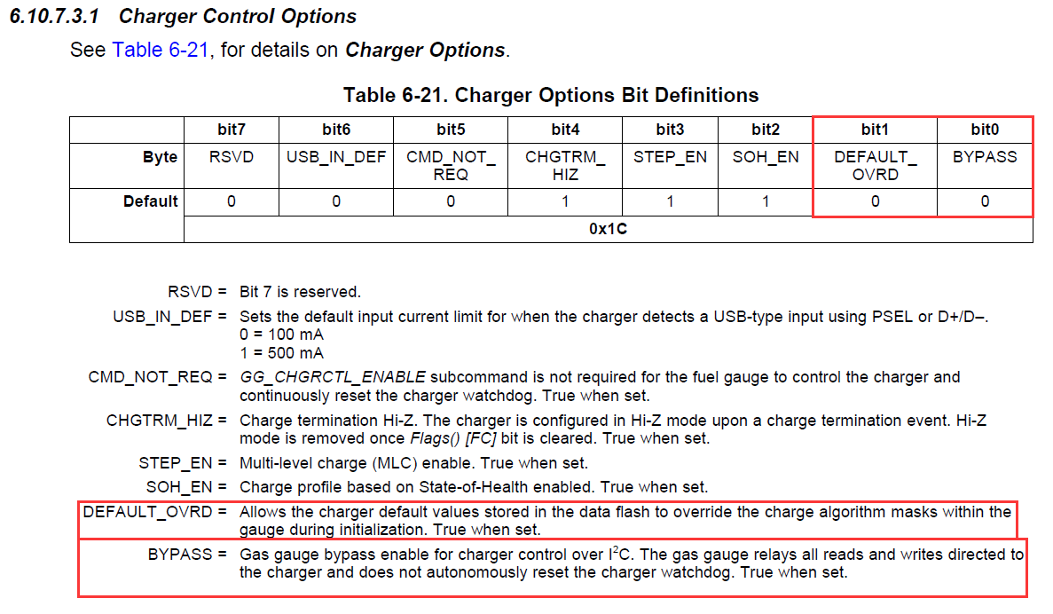 现在通过bqstudio,将Charger Info的Reg xx default值修改为期望的值,然后写入到27531的Data Flash里;将Charger Option[bit1]的DEFAULT_OVRD位1,使27531在初始化阶段的时候重载charger的寄存器默认值,以达到自动修改24192寄存器的效果。