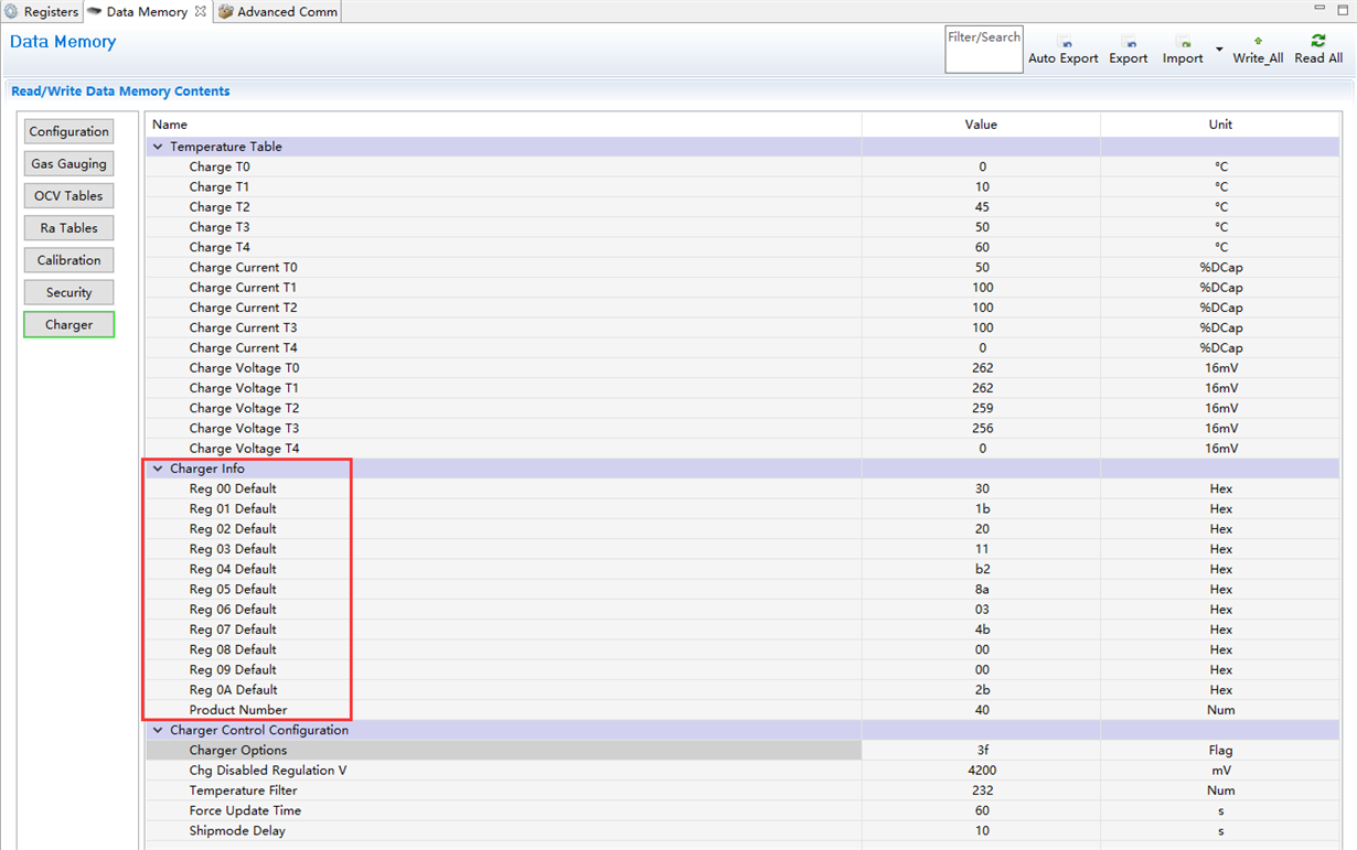 通过上述步骤后,进行断电和上电,发现寄存器的值仍为默认值,没有达到修改的效果,读出Data Flash里的配置来看,Charger Info的Reg default值是期望的值,所以这一部分修改应该是已经有成功导入到27531的Data Flash里的。那为什么DEFAULT_OVRD所述的功能没有实现呢?