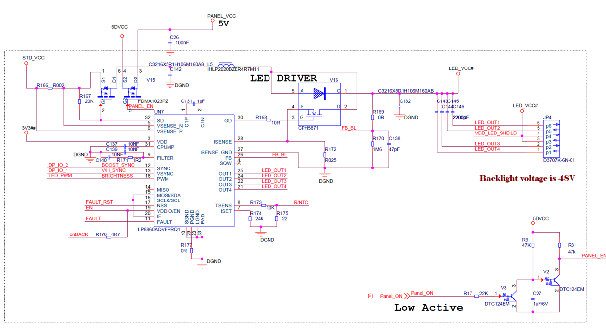 使用LP8860来驱动15颗串联的led背光电路,电路图如下,std_vcc为12V。目前还没有调试出输出电压。