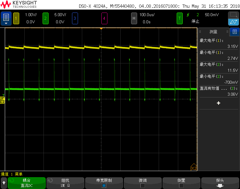 波形如下图:其中黄线为输出3.3V,绿线为SW管脚波形