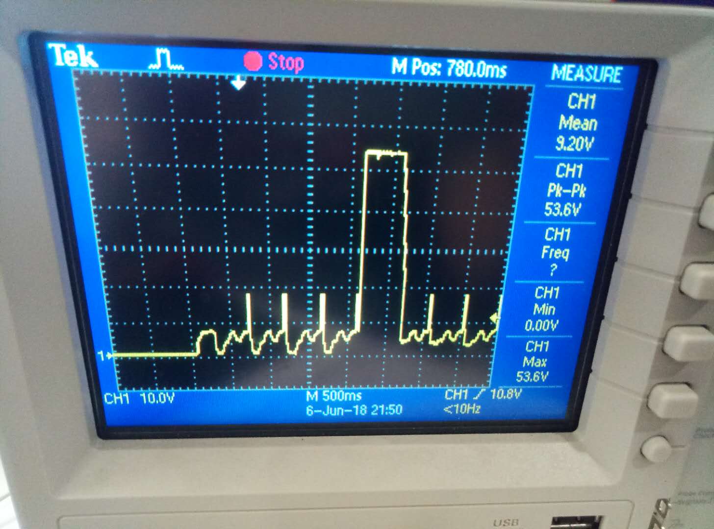 VDD-VSS在检测、分级、启动成功输出52V后电压被拉低,没法稳定在52V。然后又重新启动,重复