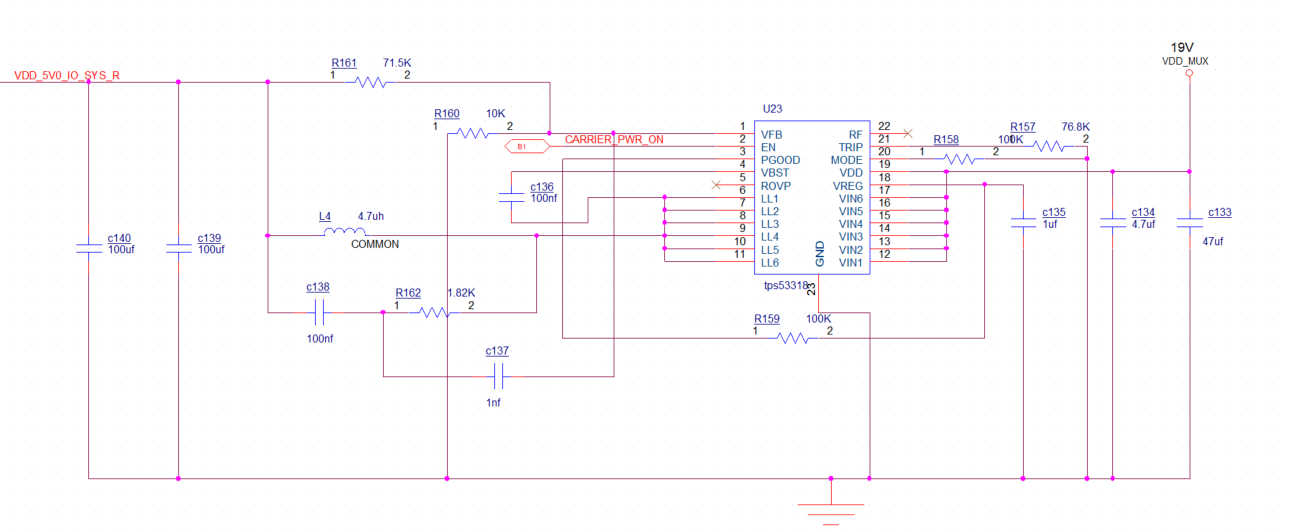 使用TPS53318电源芯片,输入19V,输出5V,运行一段时间(大概15Min左右)后就自动掉电。请问这是什么问题?附上原理图(参考的webench设计和TPS53318 datasheet)。