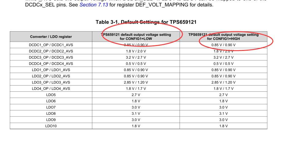 在手册上看到TPS659121的默认输出跟Config1引脚不管,无论Config1为高或者低都是输出都一样。