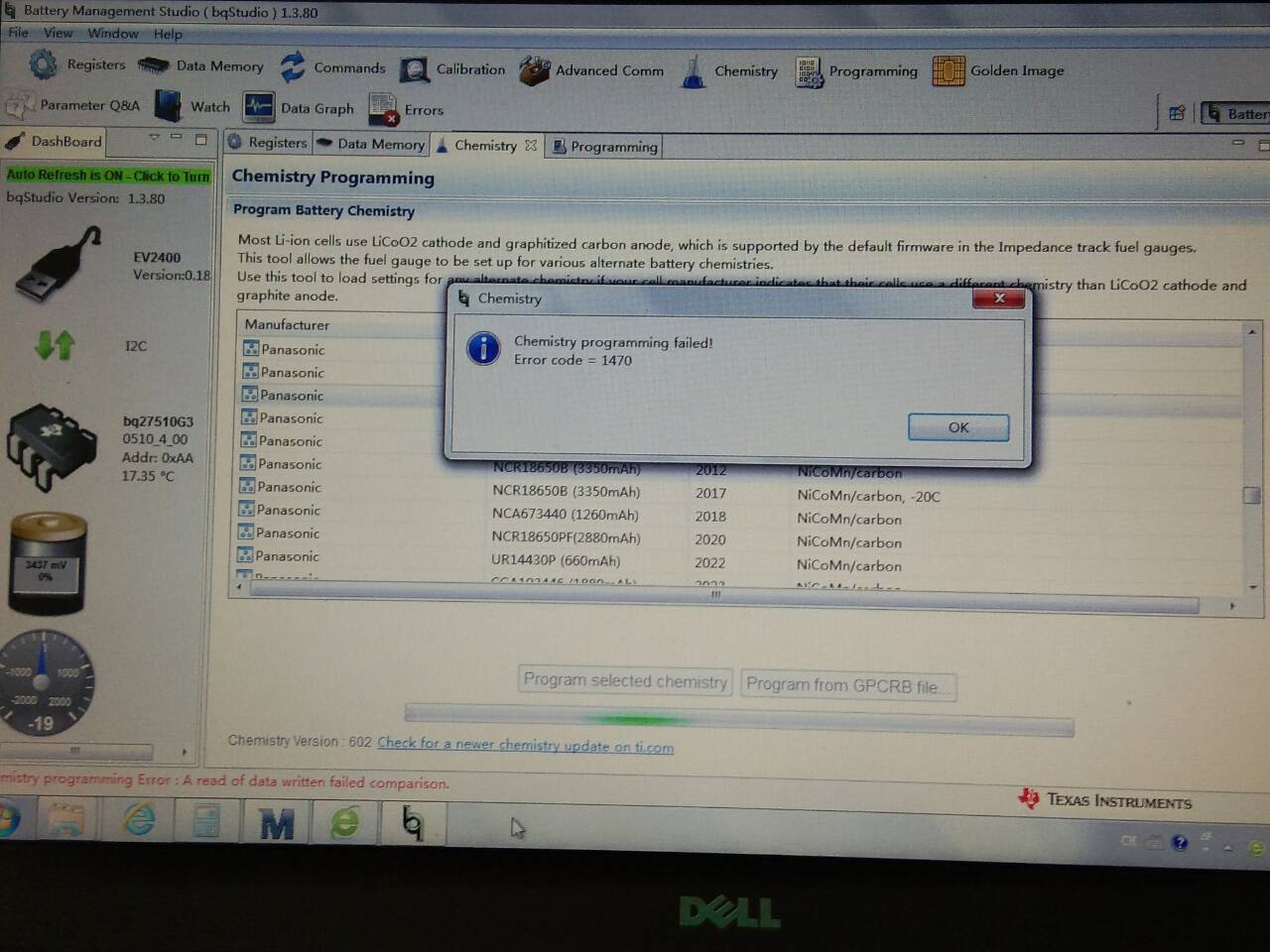 一:请问BQ27510-G3 编程选择化学ID进行烧写时提示报错,这是为什么?谢谢!如图所示