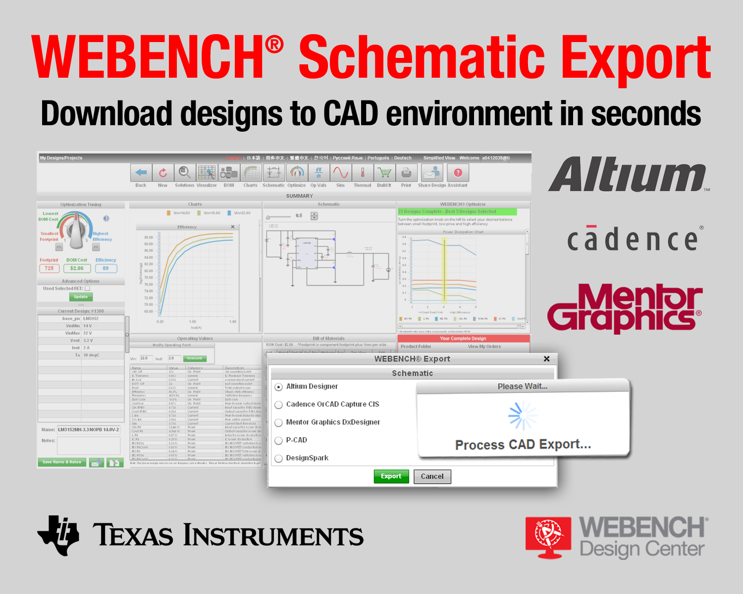 自 1999 年 National Semiconductor 推出 WEBENCH 以来,全球工程师已采用 WEBENCH 工具快速免费创建了 200 多万项设计。虽然这些工具显著简化了设计工作,加速了设计进程,但工程师将设计导出到其需要许可证的 CAD 开发平台却非常耗时。WEBENCH Schematic Export 由 TI 在 CAD 开发平台制造商的协助下开发,现在可帮助工程师立即将这些动态创建的电源及 LED 照明设计导出至各种平台,如 Cadence OrCAD Capture CIS、Mentor Graphics DxDesigner 以及 Altium(如 Altium Designer 等)等格式。