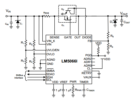 目前使用LM5066i作为hotplug控制器,官方给的电路拓扑是
