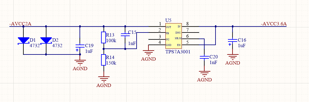 电路原理图设计如下图,是datasheet的设计类型,之前的板子是可以实现的,现在的板子却一直在变,实验温度常温,没有OTP软复位,用恒压源提供-3.6V电压,测得6号引脚为-3.3V电压左右,输出电压也是不正常,困扰了许多天了,满足芯片手册的输出电流和电阻要求,焊接也没有异常,但芯片就是一直不稳定,这是为什么呢?