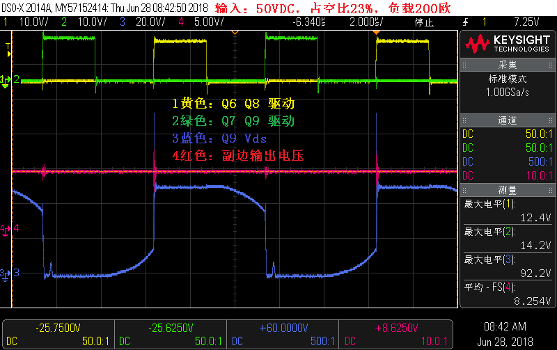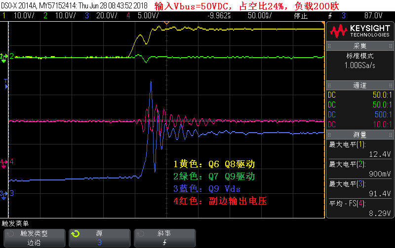 在高压侧VBUS供电50VDC,低压侧接200欧姆电阻作为负载,Q6和Q8同时开关,Q7和Q9同时开关,Q1~Q5不提供驱动,使用示波器抓取Q8和Q7的驱动波形,Q9的漏源极电压Vds,低压侧输出电压,出现问题如下: