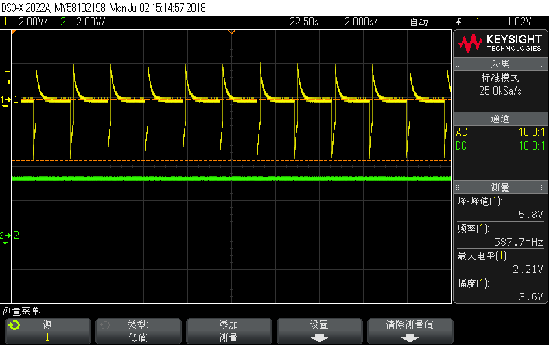 示波器测得状态引脚波形如下(STAT1:CH1, STAT2: CH2):