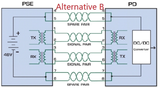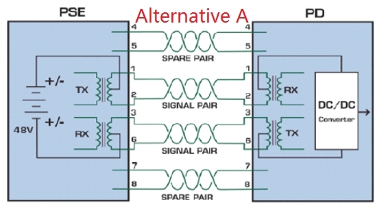 PSE端有如下两种方式:Alternative A和Alternative B。我司产品只考虑支持Alternative A方式。也即是,在PSE端只有PIN1/PIN2接48V+、PIN3/PIN6接48V-;