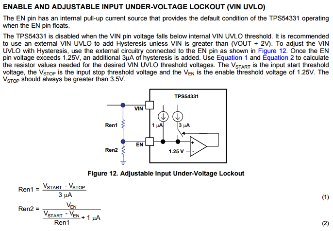在设备使用时关断电源,开关电源的残余电量会持续使TPS54331输出5V,想使用TPS54331的UVLO功能达到欠压关断的效果,