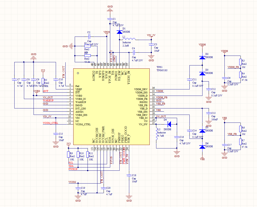 本人根据手册设计了TPS65185的板子,程序中先给wakeup高电平,延时一段时间后给pwrup脚高电平,测得vn脚会有-10v电压并且一直降低到0,其他脚无输出, 用软件debug之后到读到0x08地址的数据是0x20,想知道为什么vn脚会输出错误。