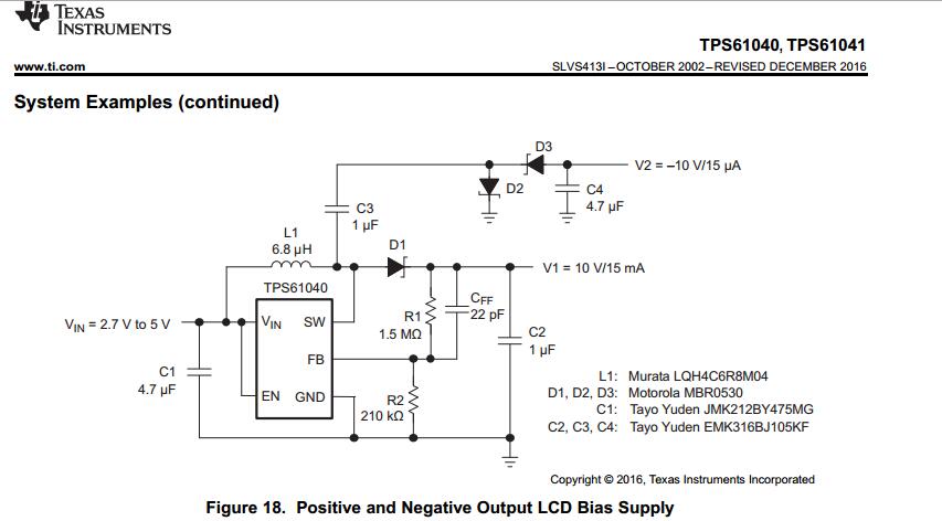 目前我们在用TPS61040给触摸屏供电,输入电压5V(由开关电源提供),经过TPS61040升压到10V,原理图我们参考的是TPS61040数据手册中典型电路“Figure 18. Positive and Negative Output LCD Bias Supply”(见下图)。我们按照典型电路焊好元器件(R1选用1.5MΩ,R2选用210KΩ),按照公式(5)计算Vout应该为10V才正常,我们测试有些芯片的实际的Vout竟然达到了12V,大部分芯片输出10V正常。