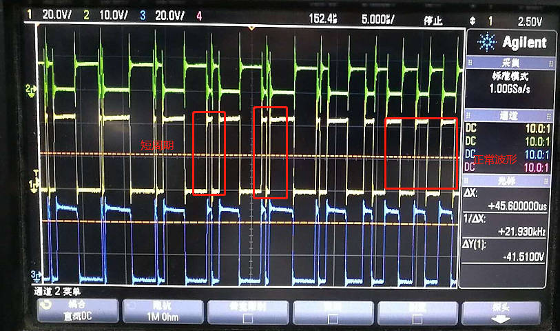 输出波形:通道1为SW波形,通道2位上管驱动波形,通道3为下管波形,为什么SW有个短周期波形,最后又回到正常波形?跟输入的检流电阻大小有关么?