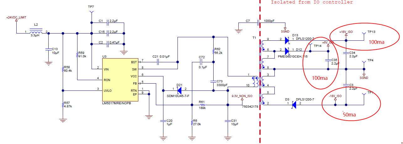 其中LM5017电路中使用变压器参数如下,其中有标记15v  50ma;是否此变压器限制不能满足我的设计需求?
