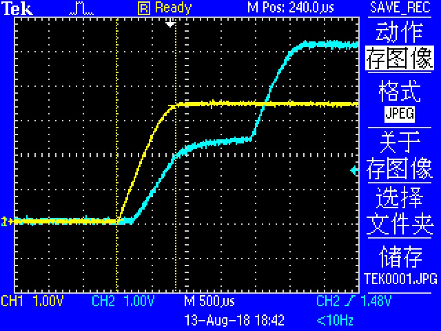 上电后发现3.3V输出正常,上升时间正常,POK输出也正常。但是5V的输出有台阶:会有一个约1ms,2.5V的电压,然后再上升到5V。