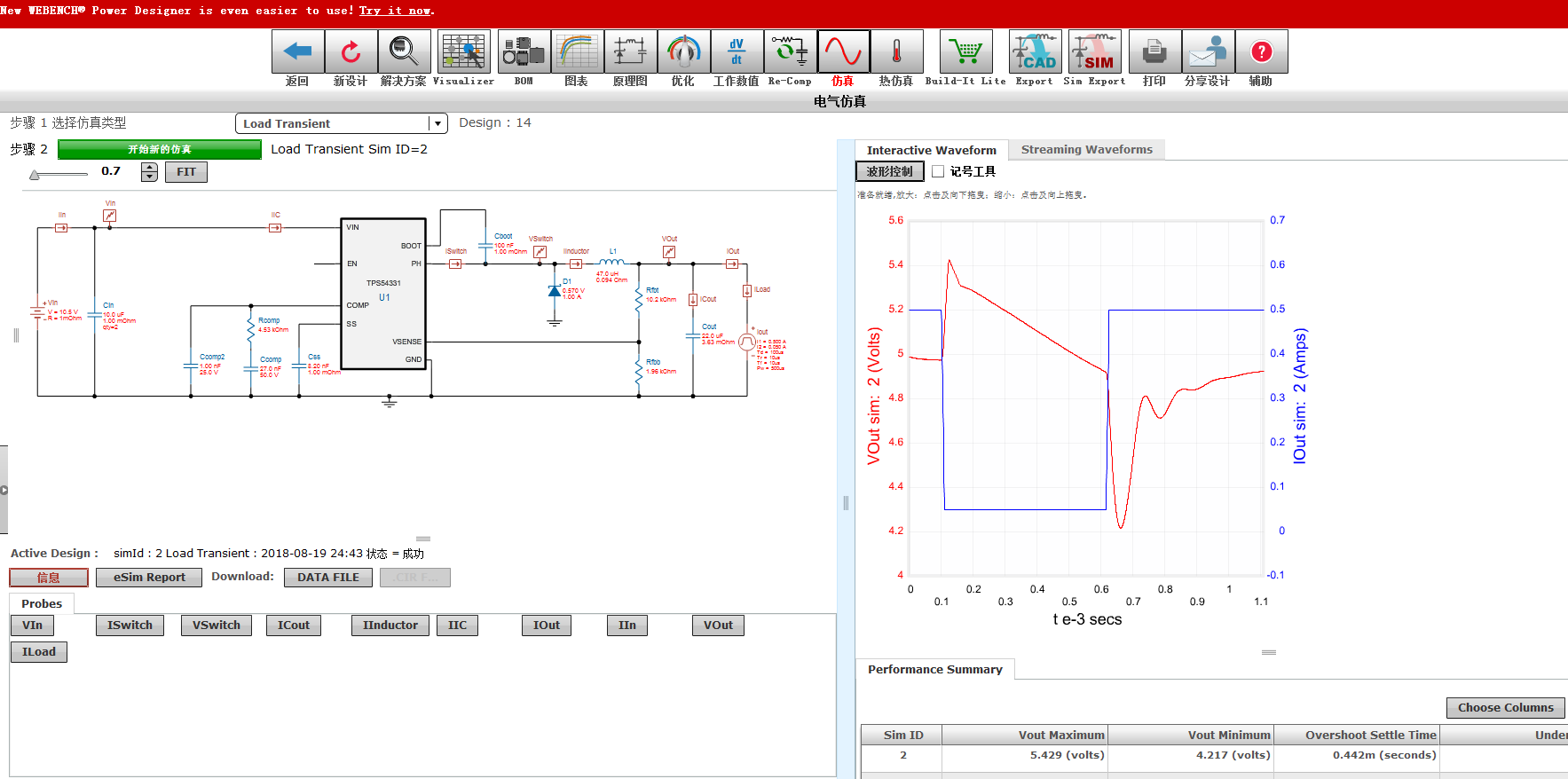 1. 然后进入WEBENCH,然后选择 TPS54331,打开SIM界面,仿真瞬态响应,发现有0.5V的波动,请问该如何去调试呢,非常感谢