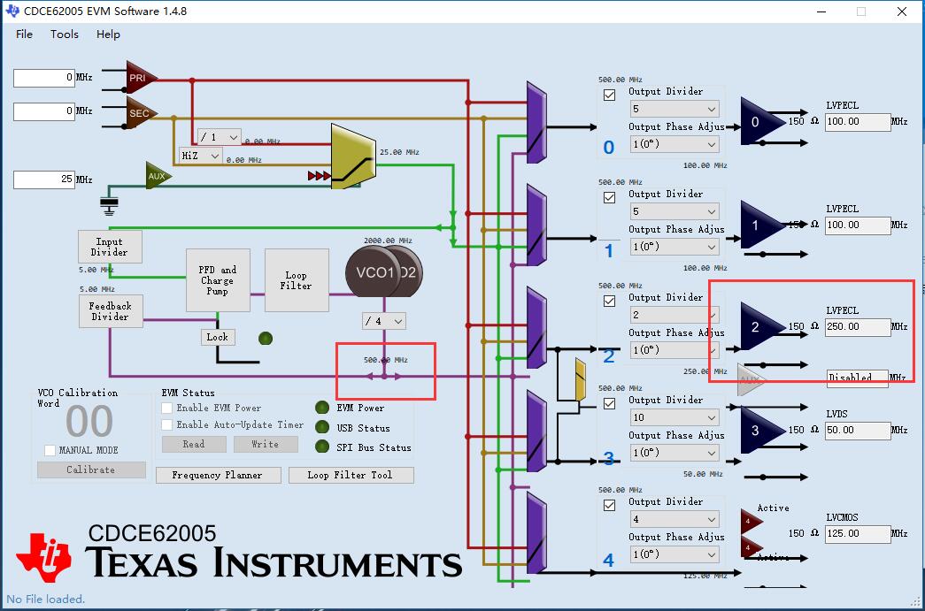 用的仿真器配置,具体的配置如下图。紫色线出来的是一个500MHz的时钟,然后分频需要100MHz、50MHz、125MHz,最后还需要给DSP6657的SRIO供156.25MHz,请问怎么分配呢?我看分频出不来。