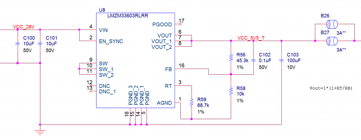 lmzm33603,输入电压28V,电流85mA,输出电压5.5V,电流244mA,效率58.4%,实测芯片表面温度55度