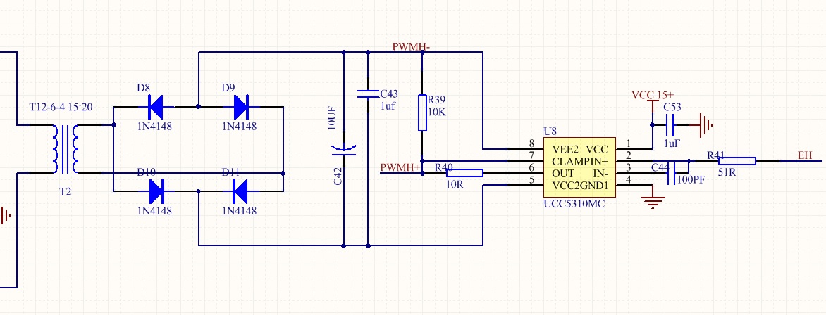 请教,采用UCC5310驱动MOSFET ,输入电压15V, 频率75KHz,占空比45%,输出电源15V,输出端 6脚、7脚 无信号,
